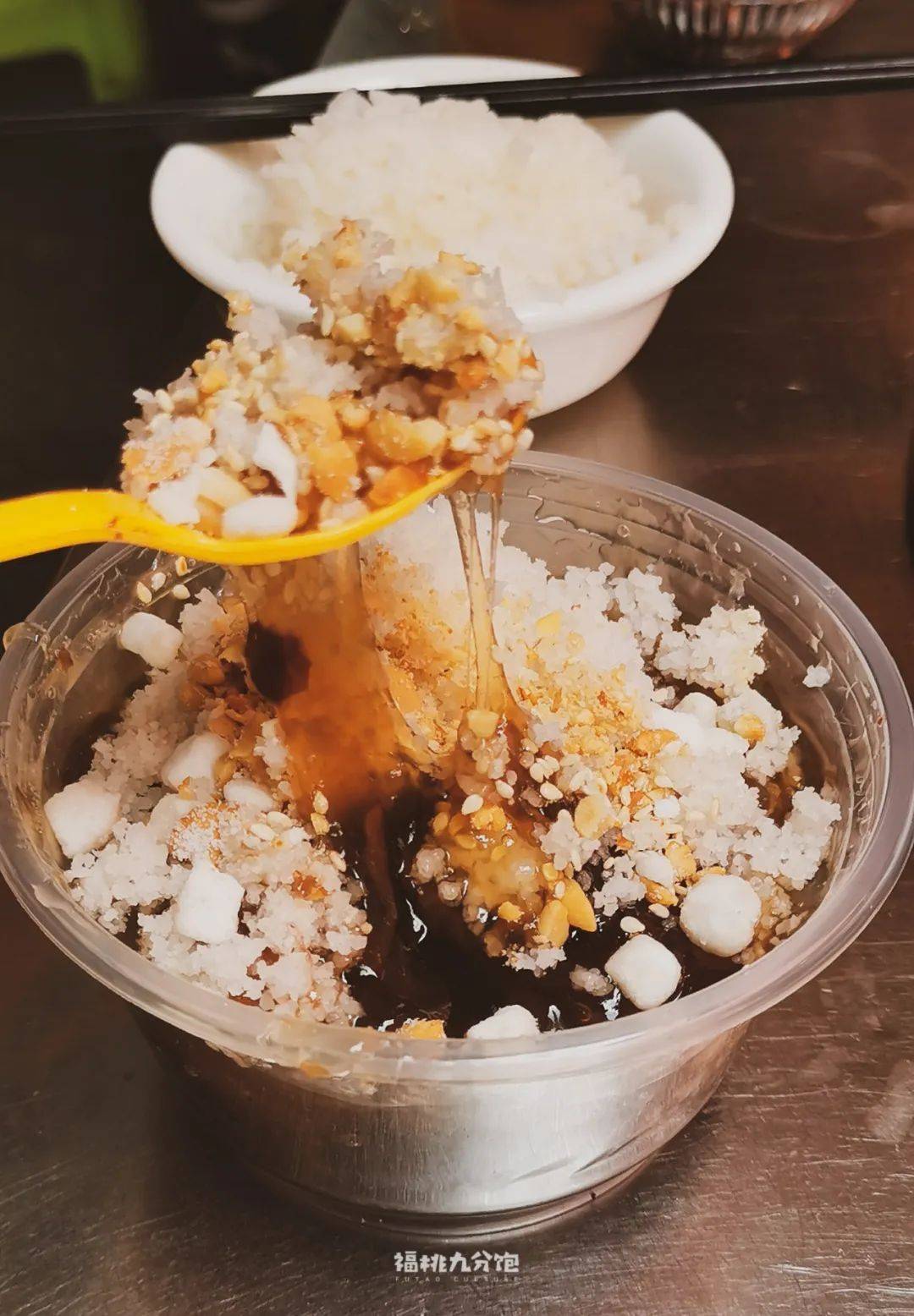 圆滚滚的糯米饭黄颗粒分明、嚼劲十足,整体呈现出被酱油浸润的沉稳棕色。猪油在增香的同时,闪着晶莹剔透的光泽。葱花提味、酸萝卜解腻,白糖已然悄悄融化在缝隙之间。口感层次鲜明,却又你中有我、我中有你,融合得恰到好处。