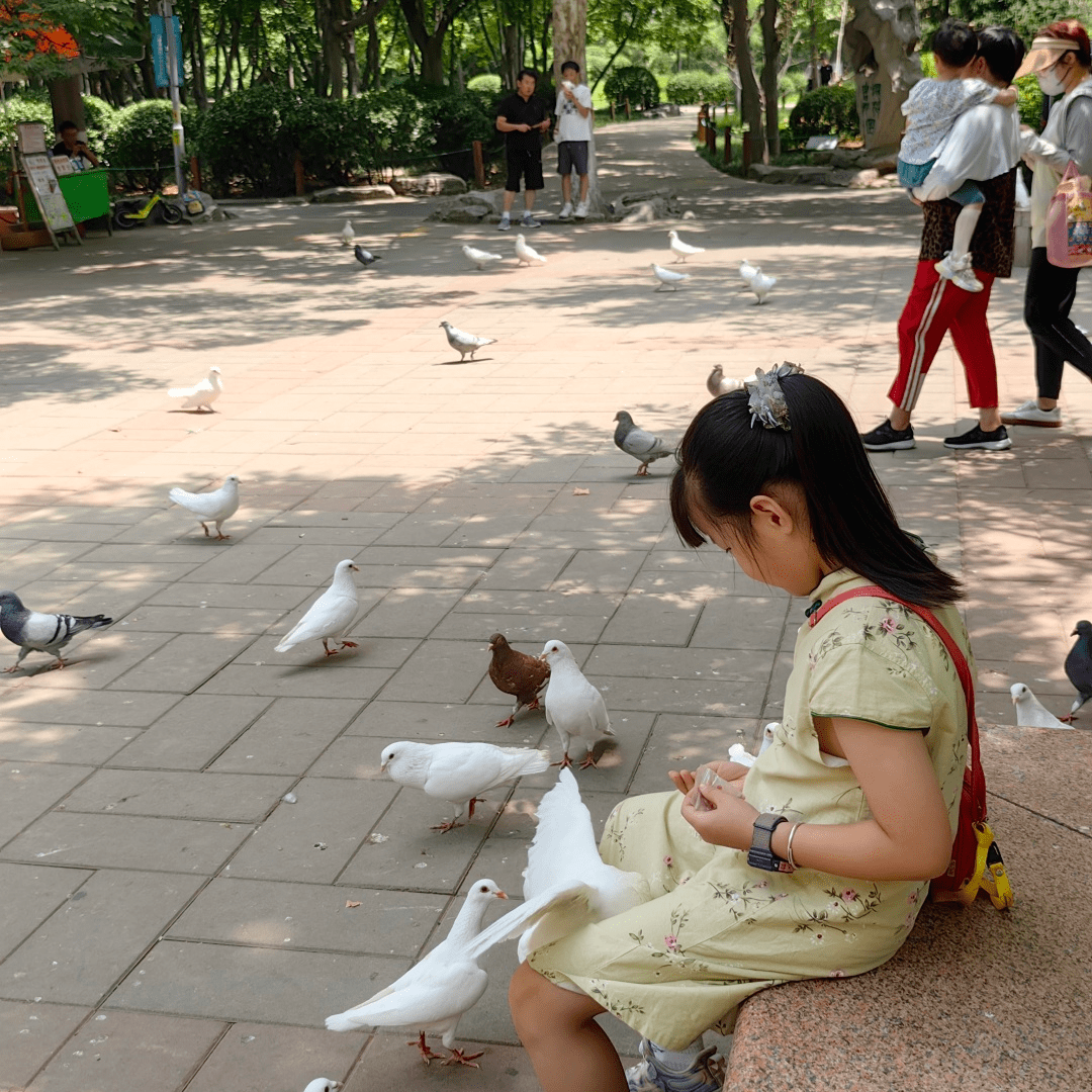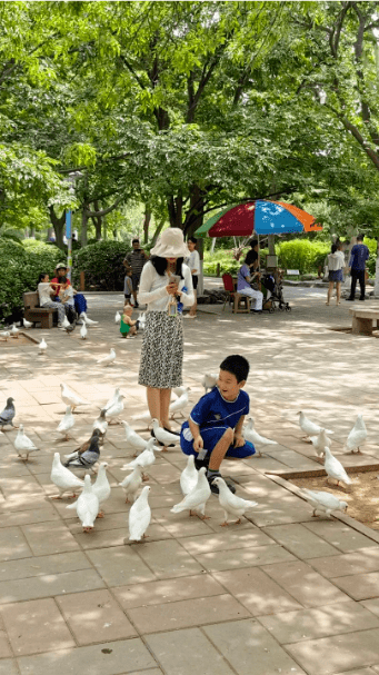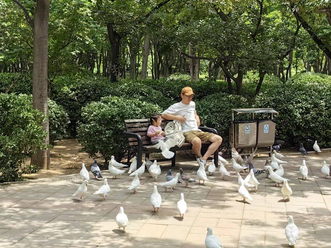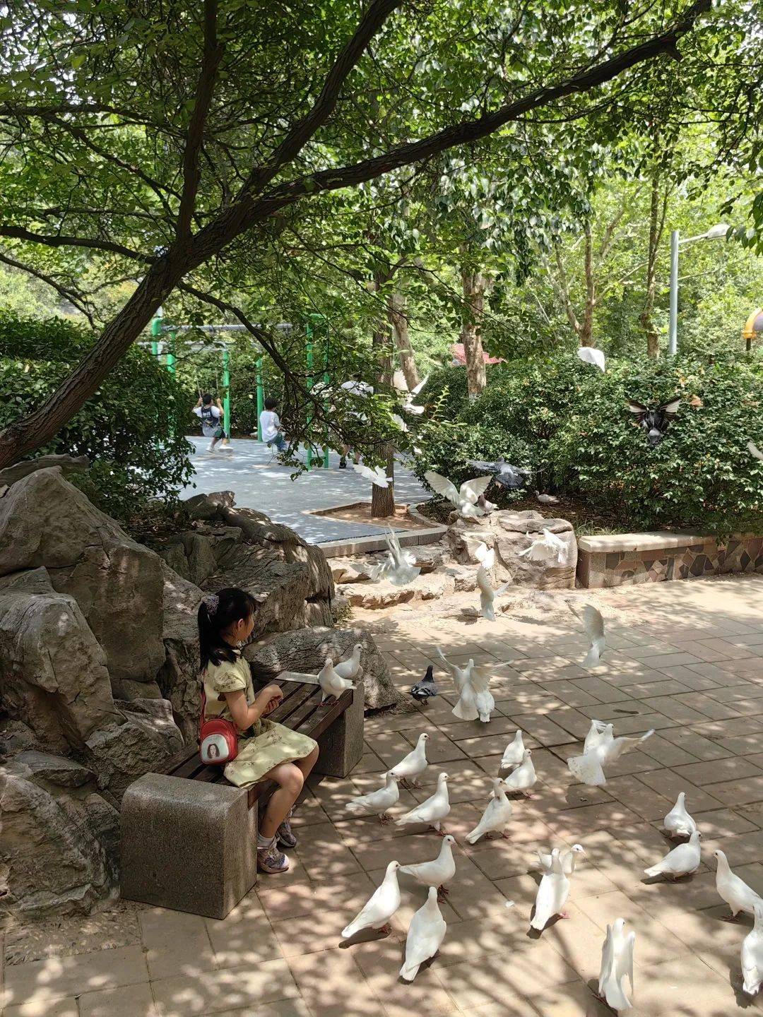 鸽子也是一点不怕人,会调皮地落在小朋友的肩膀上、胳膊上亦或是手掌上,“咕咕咕”地和人交流着。小朋友会高兴的欢呼起来~