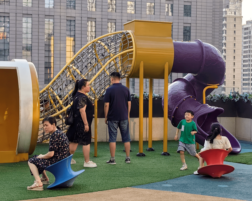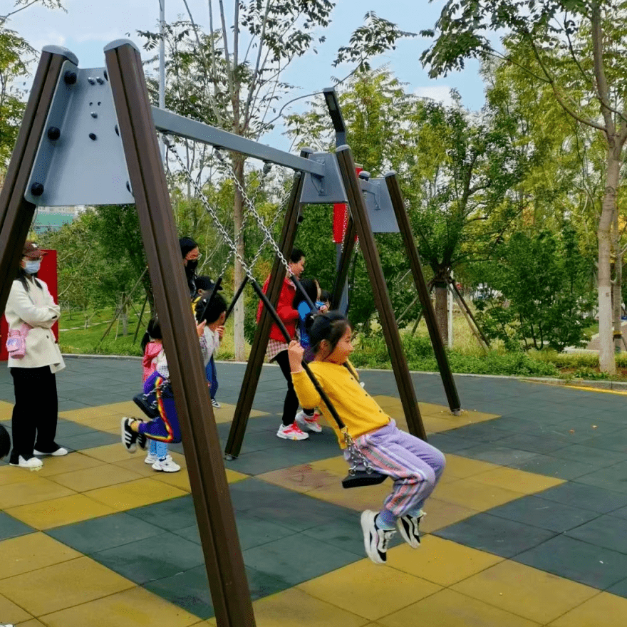 在运动场地旁边,新配套了一片儿童娱乐区。多功能滑梯、转盘、跷跷板等经典儿童设施和孩子一起玩乐,瞬间把你带回到童年。