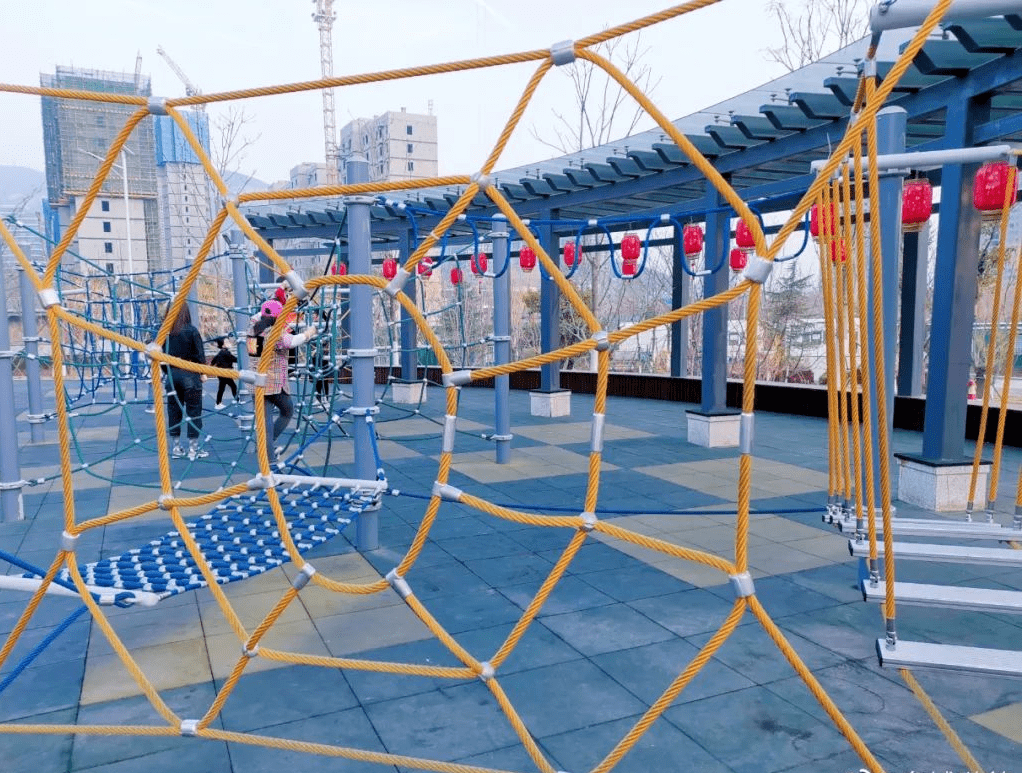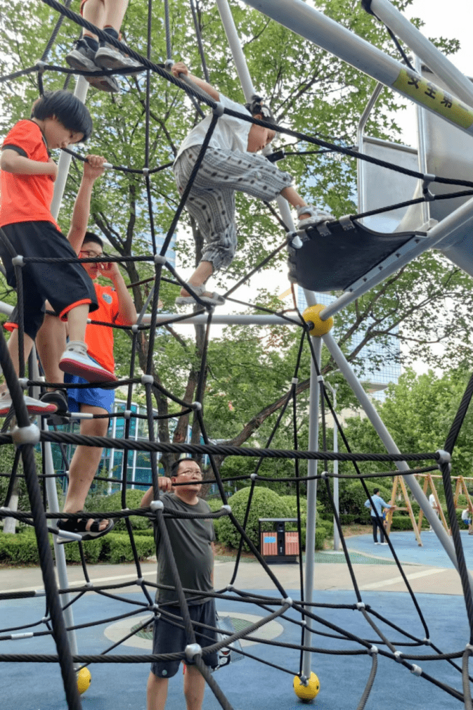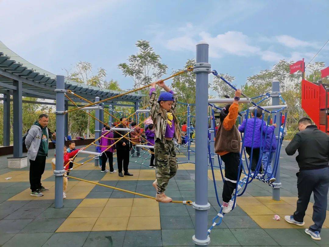 “龙船”的旁边还配有伙伴秋千、金字塔爬网、网绳空间设施,小朋友们发挥想象空间,把游戏设施玩出了多种花样,益智健身,各得其乐。