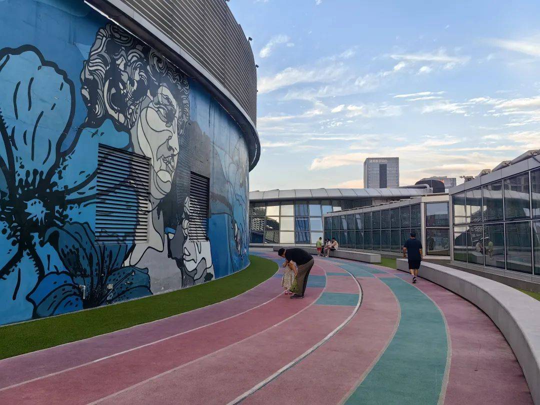 在万象城楼顶,有一处天空田径场,柔软的塑胶跑道,小朋友撒欢跑也不怕摔倒。
