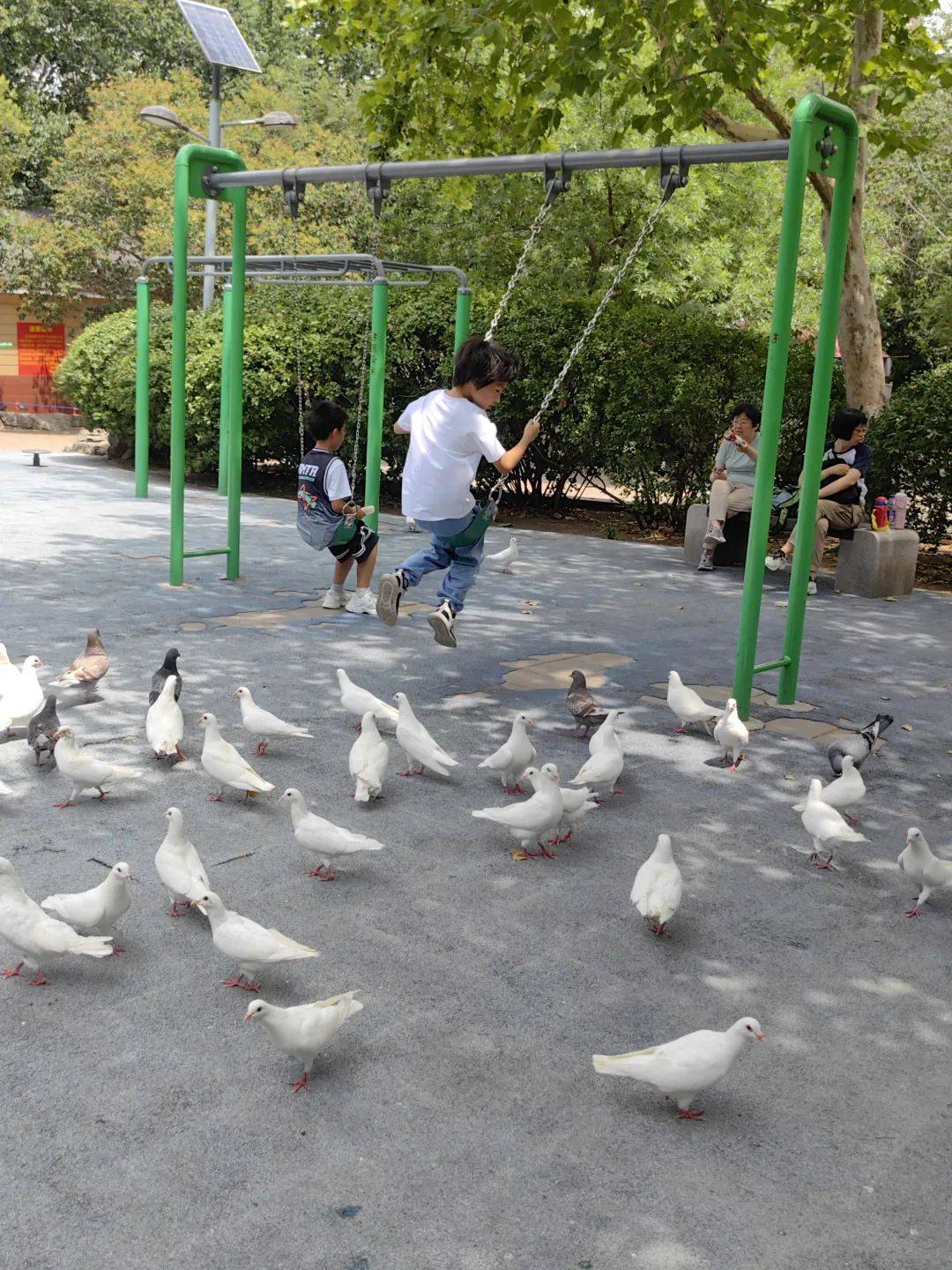 当小朋友从滑梯上冲下,鸽子们会被突如其来的惊吓所扰,扑棱棱飞上树梢,小朋友则会乐地“咯咯”笑。