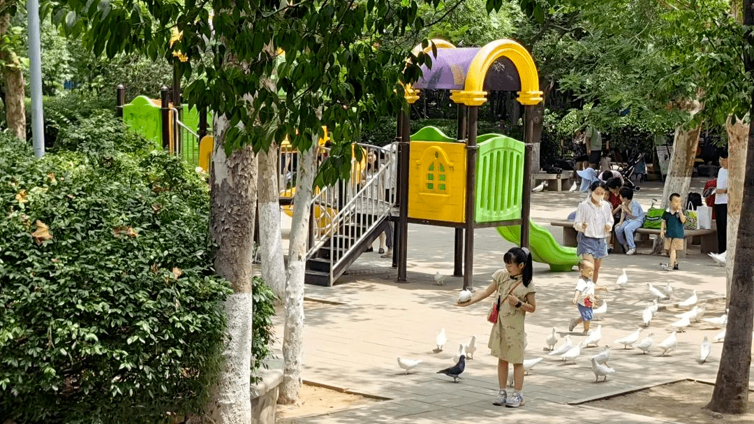 颜色靓丽的多功能滑梯总能吸引很多小朋友爬上爬下,可爱的白鸽也成为了他们的玩伴,或盘旋其上,或悠闲地在地上踱着步子。