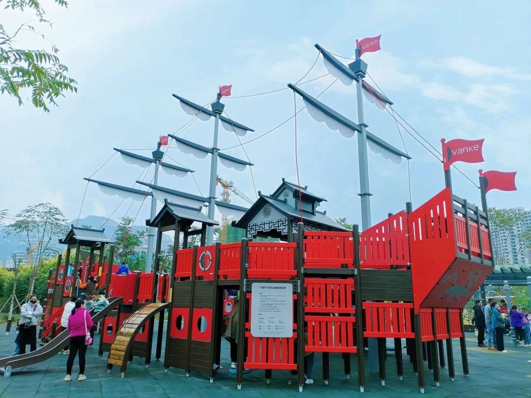 望岳康体公园内一艘“龙船”很是吸引小朋友的眼球。高高的桅杆,牵拉的绳索,红色的旗帜,很远便能看到。