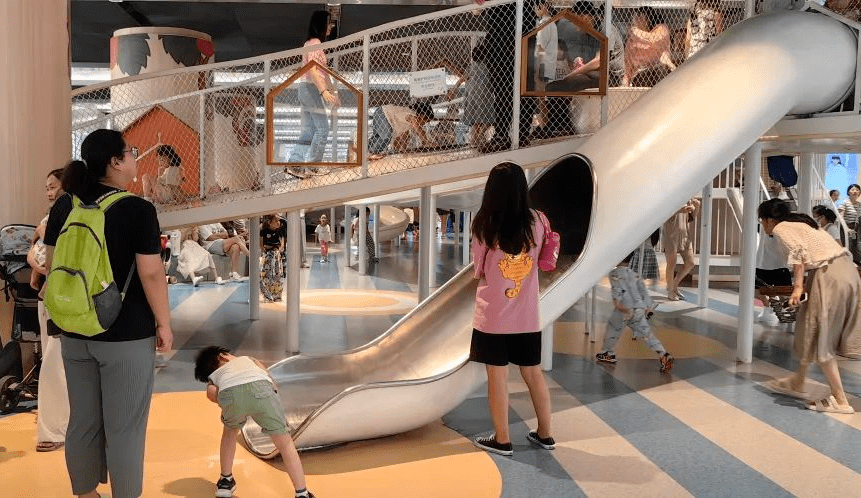 在泉城人才公园旁边的万象城F3,有一个很受小朋友欢迎的免费的超大综合体滑梯,冬天不冷,夏天不热,真是太“抢手”了!