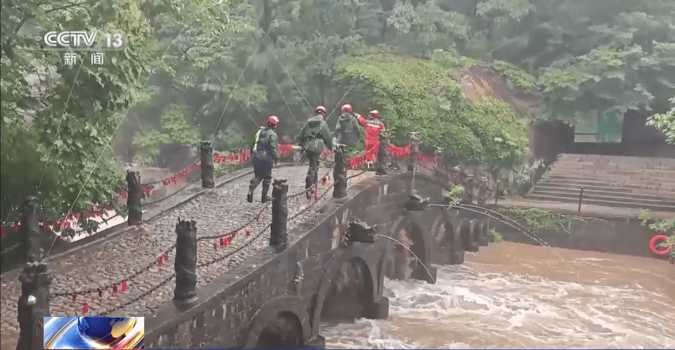 消防救援人员在老龙潭景点看到,暴涨的河水已冲上堤岸,将人行步道全部淹没。因水流湍急,游客不敢贸然下山。消防救援人员一边安抚被困游客情绪,一边迅速利用绳索搭建救援通道。此时,河水已上涨到小腿位置,水流也越来越急,为防止游客跌倒,救援人员在激流中拉紧绳索,筑起人墙,手把手引导游客蹚过急流。游客中有不少孩子,消防救援人员将他们抱起,小心护送下山。经过约1个小时的紧张救援,被困游客全部被转移到山下安全地带。