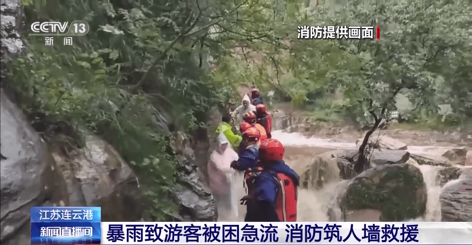 昨天(11日),江苏连云港遭遇暴雨,短时强降水导致一景区河水猛涨,多名游客被困。当地消防立即出动展开救援。