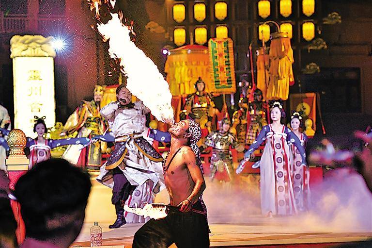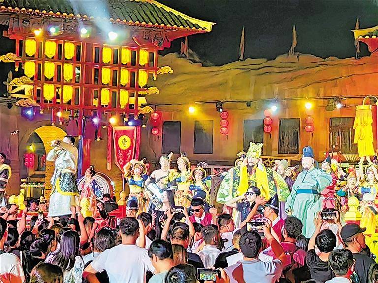 “现场氛围太嗨了!”《灵州会盟》的舞台上,“唐太宗”和群臣们跟着乐曲尽情摇摆,外地游客胡海娜的情绪也被带动了起来,情不自禁地跟着晃动起来。胡海娜说,这台剧给自己补上了一堂历史课。