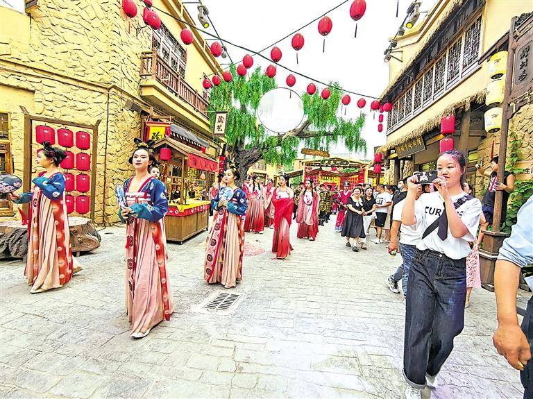 迈出检票口即穿越了。仿古的建筑、穿着古装的行人、穿着盔甲的士兵……就连商户也跟着换了装。在古街上行走,游客可能遇到一位边塞诗人、也可能遇到了一位将军,或一位求经的僧人……拍照、击掌,他们主动和游客互动,杨涛说,小镇要求大多数演员跟游客要有近距离的互动。
