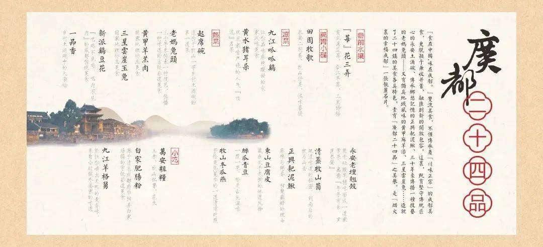 这里,既有坚守传统匠心的永安土酒碗、传承乡愁记忆的正兴耙泥鳅、三十年来传播一种技艺的老妈兔头……又有独具地域风味的黄甲麻羊汤、三星云崖兔……造就了过去双流二十四个镇街的特色美食特色,“广都·二十四品”由此而生。
