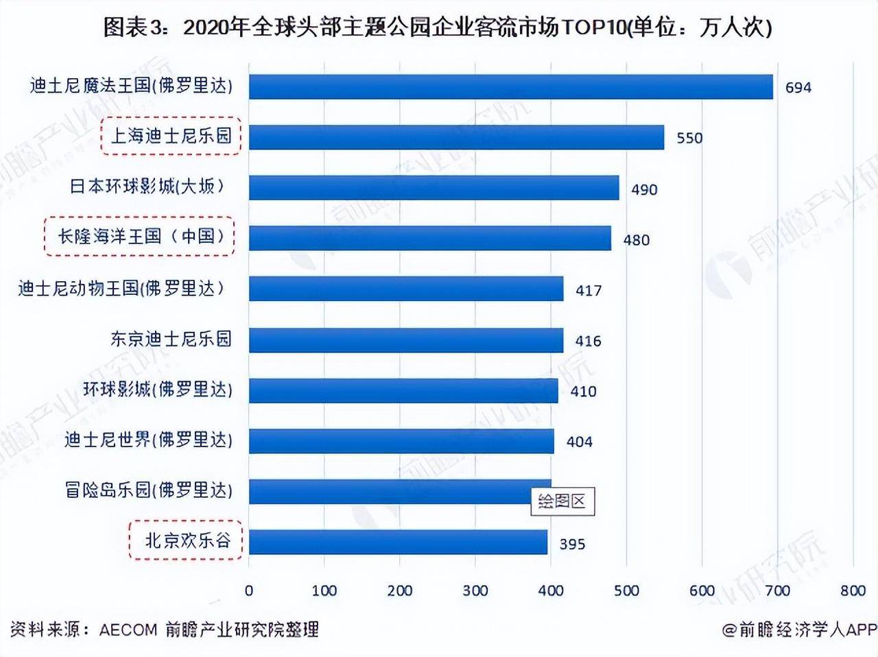 2020年全球排名前10位(按照2020年客流量排序)的主题公园中,来自中国的上海迪士尼乐园、长隆海洋王国(中国)、北京欢乐谷分列第二、第四和第十位。