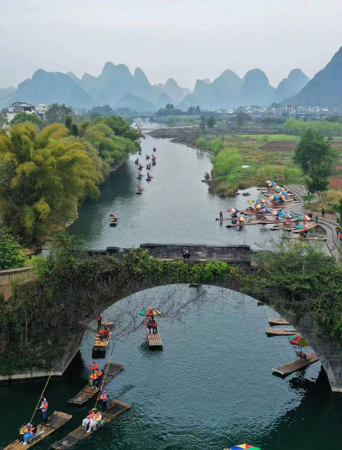 水绿草,开朗而明快;若逢雨天,更是雾绕云遮,百媚千娇,将阳朔风光表现的淋漓尽致。