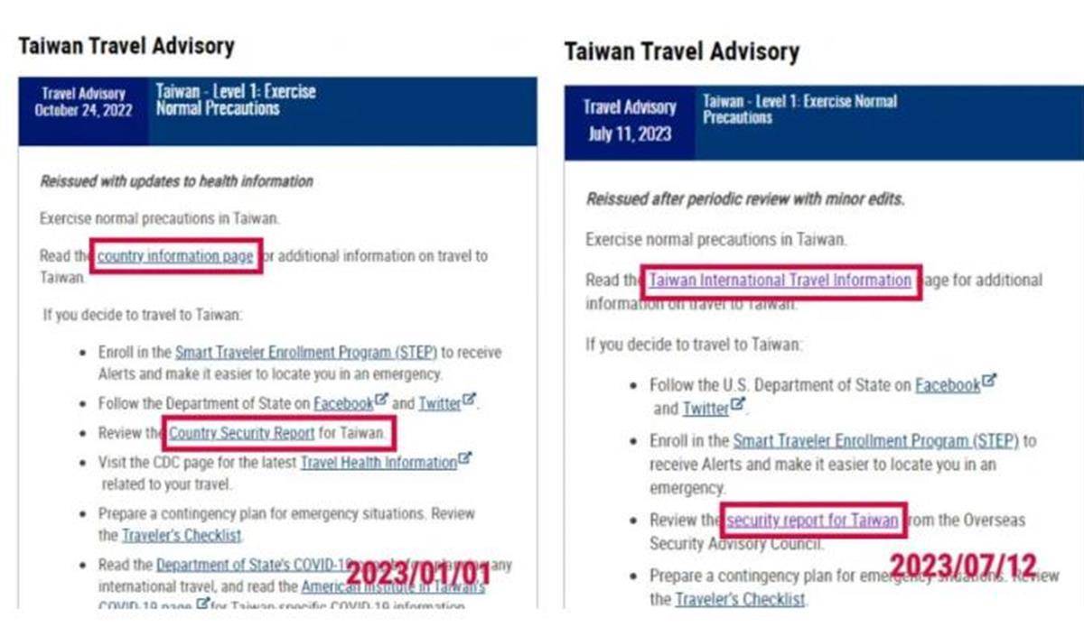台媒发现,若仔细比较11日与去年底的公告内容,美国国务院新版公告中仍维持台湾的第1级别旅游警示,相关建议与政策并无更动,唯独有两处措辞稍有变动。