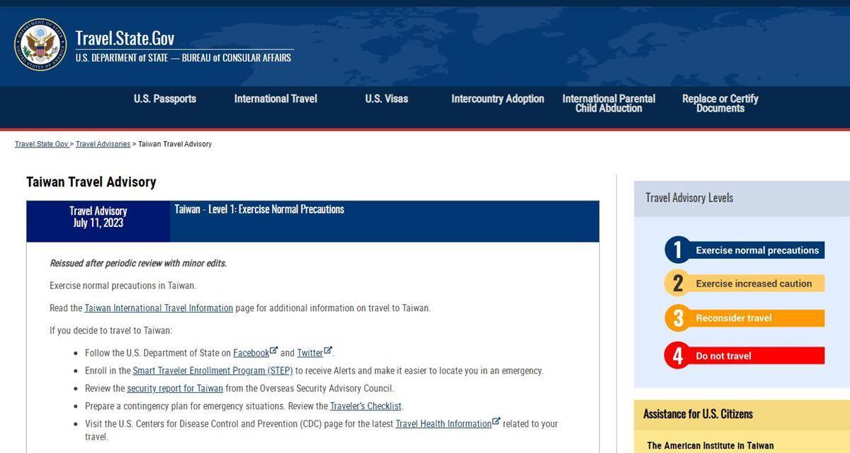 美国国务院上一次调整对台旅游建议是在去年10月24日,当时因台湾已解封,故美国将对台旅游建议从第3级的“三思而后行”(Reconsider Travel)降至最低级别的“常规预防措施”(Exercise Normal Precautions)。