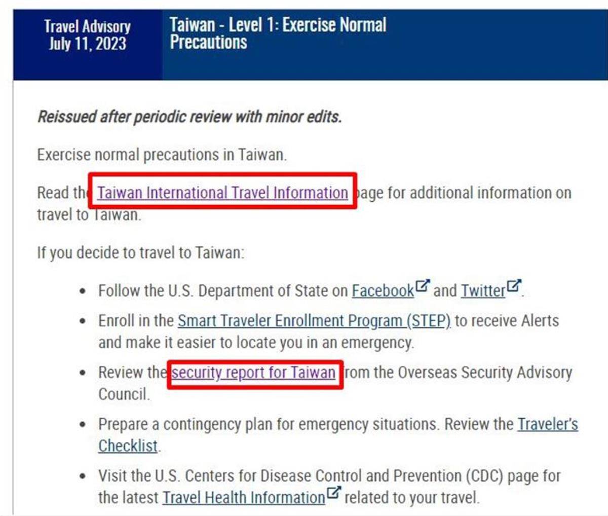 去年版本中,美国国务院建议美国公民阅读“国家资讯页面”(country information page),以进一步了解台湾旅游状况,新版内容已改为阅读“台湾国际旅游资讯”(Taiwan International Travel Information)页面。