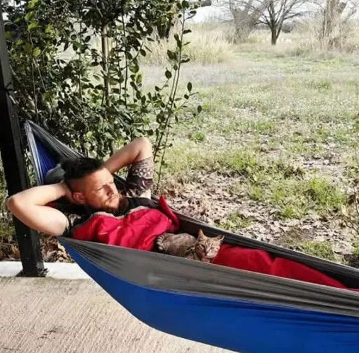 骑车累了,一人一喵找个地方在吊床上休息一会儿。