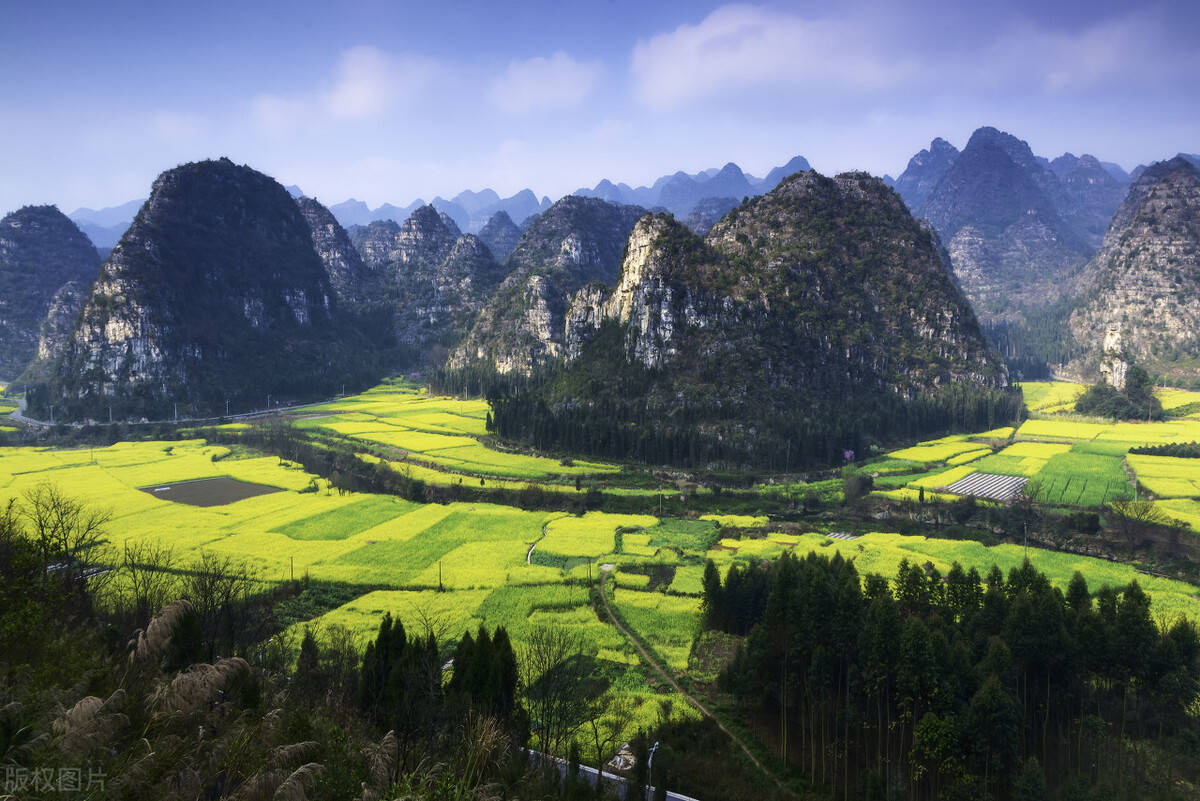 万峰林是中国著名峰林,曾被国家地理杂志评为中国最美五大峰林之一,走进万峰林,只见一座座奇峰从拔地而起,错落有致,姿态万千,与弯曲的河流、古朴的村寨、开满油菜花的田园融为一体,宛如世外桃源。