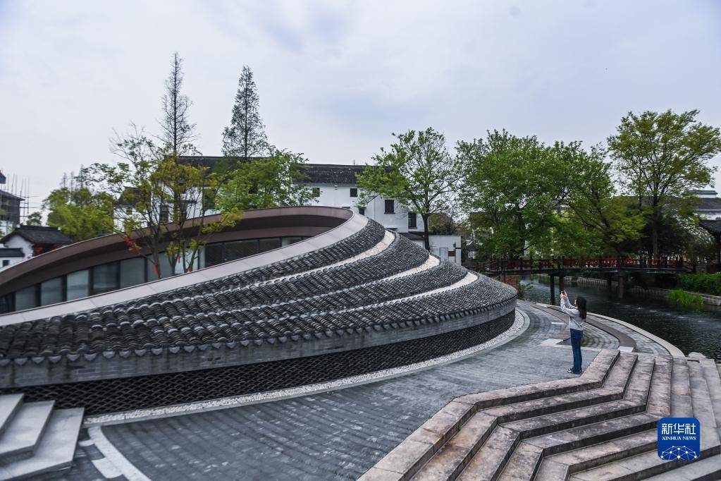 4月3日,游客在嘉兴市秀洲区王店镇镇中村的未来乡村展示馆外拍照留影。近年来,浙江省嘉兴市秀洲区推动“秀水田园”村居图、秀美文旅线路、秀水乡愁点、秀色风景带等乡村景观带的打造,通过“以精品农业为支撑、以乡村旅游为目标”进行产业融合发展,不断提升新时代美丽乡村建设水平,助力乡村旅游和共同富裕示范区建设。截至目前,嘉兴市秀洲区已实现省级美丽乡村示范镇创建全覆盖,建成美丽乡村精品线8条、省级未来乡村3个、特色精品村23个,市级精品示范村12个。新华社记者 徐昱 摄