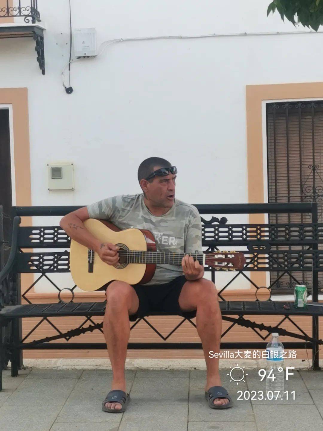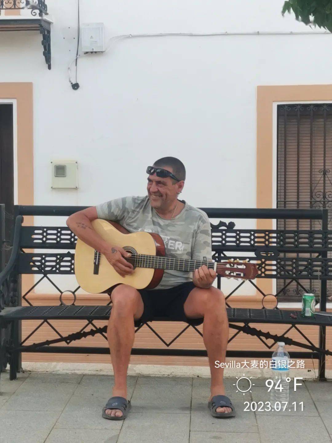 这位老兄带着一把吉他,我提到《阿兰胡埃斯》、《爱的罗曼斯》,他都能弹一段。不过他更喜欢自弹自唱。