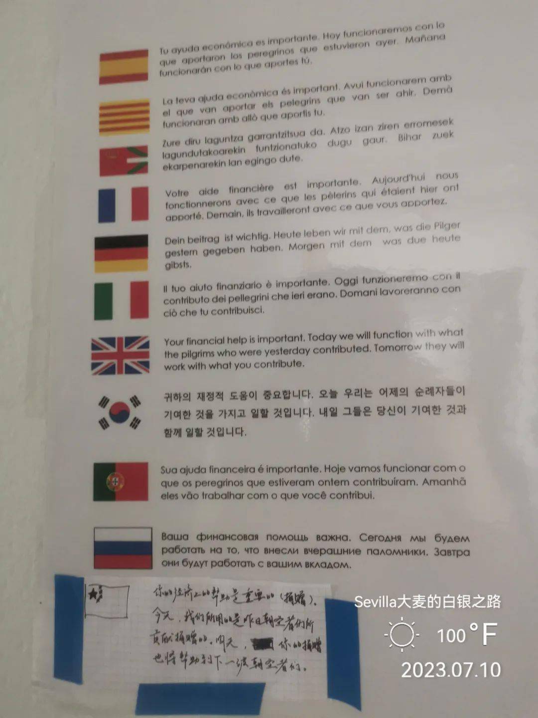 稍晚,在Albergue门外遇见那位西班牙同行者,昨天住在同一家Albergue,让我们早上5点喊醒他,但最终比我们晚三四个小时才到。