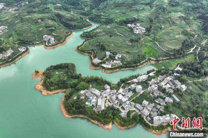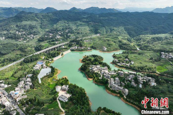 7月12日,航拍镜头下的贵州省毕节市赫章县平山镇中寨社区、中山社区,碧水、青山、民居在夏日构成一幅美丽的乡村画卷。