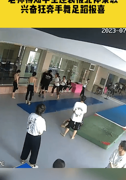 据大象新闻分享,近日在山东枣庄,训练场内大家正在休息,突然一名女老师尖叫着冲了进来,她兴奋地狂奔,手舞足蹈向一位黑色衣服的男孩报喜,高喊着“考上了!”