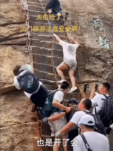 近日,陕西华阴一位游客爬华山云梯时意外踩空坠落。目击者称,该女子掉落时被后面的几位男士接住。