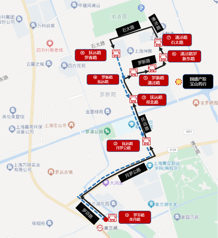 班车路线:起始站为美兰湖地铁站(罗芬路美丹路),途径罗芬路、月罗公路、抚远路、罗新路、潘泾路、石太路,到达抚远路罗春路站后,原路返还至美兰湖地铁站。