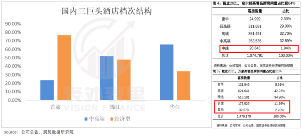 具体来看,国内连锁酒店三巨头,经济型酒店占比最低也超过三成,反观海外标杆酒店,万豪精选以下档次占比仅有14%,希尔顿中端房间更是低至1.94%。