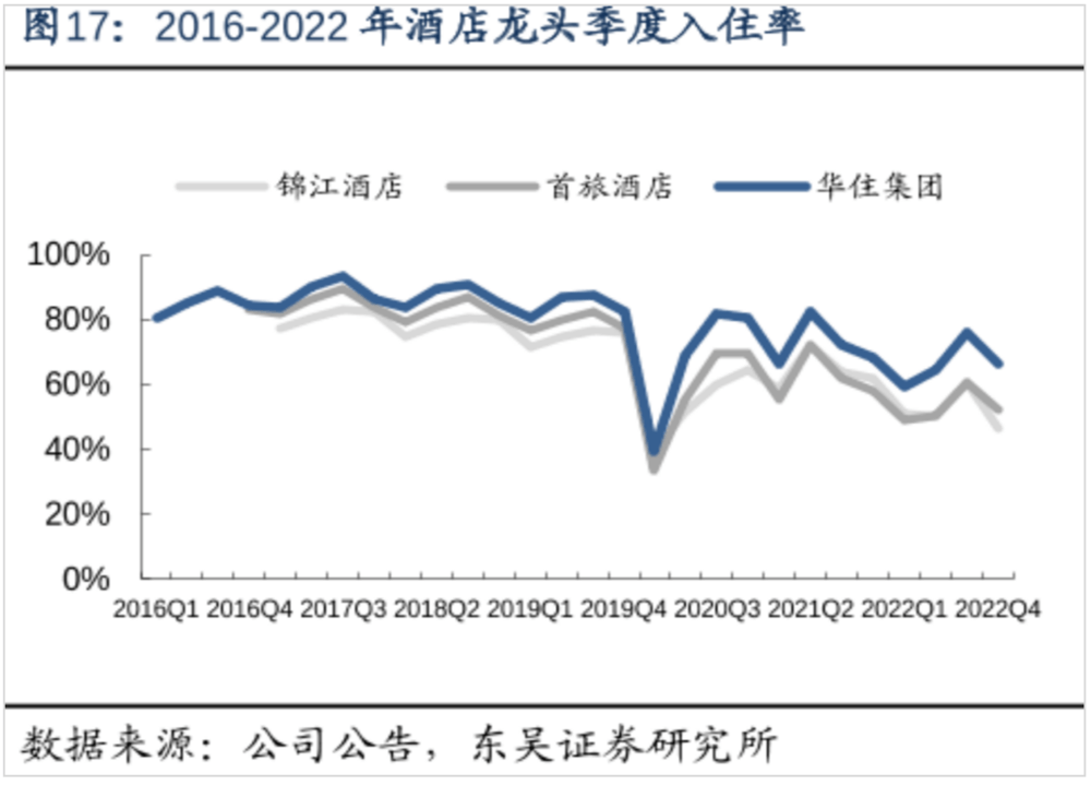 如下图,2018~2022年,经济型酒店居多的锦江波动最大,高端化占比高的华住入住率波动较为平稳。