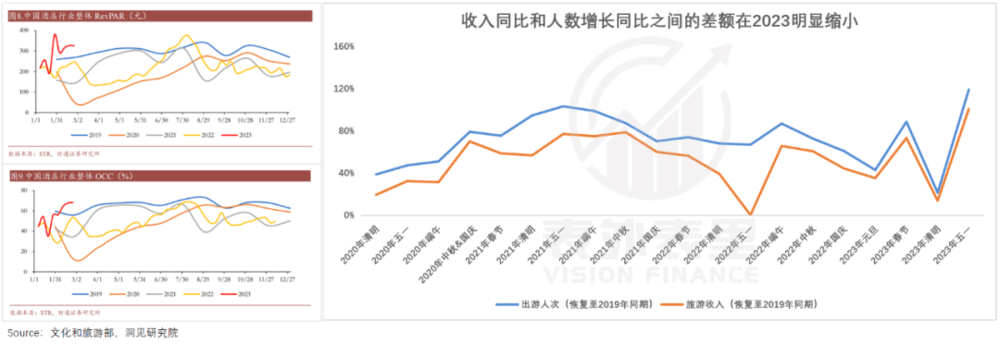 可以看到,国内酒店房价涨幅在特定节假日明显高于入住率;收入同比和人数增长同比之间的差额在2023年也明显缩小,这意味着,每个房客支付的房费变高了。
