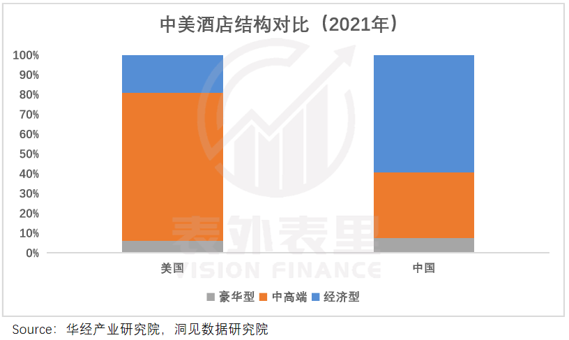 以中美酒店结构为例,中国是经济型酒店为主的金字塔型结构,美国是中高端占比居多的橄榄球型结构。