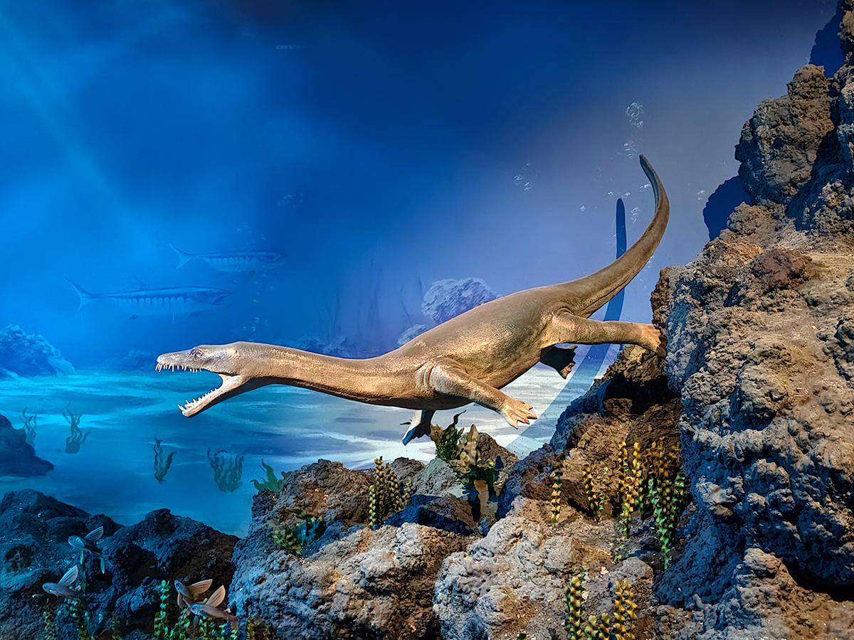 龙的时代展厅通过展览鱼龙、翼龙化石及霸王龙化石模型揭示海洋是生命的摇篮这一主题。
