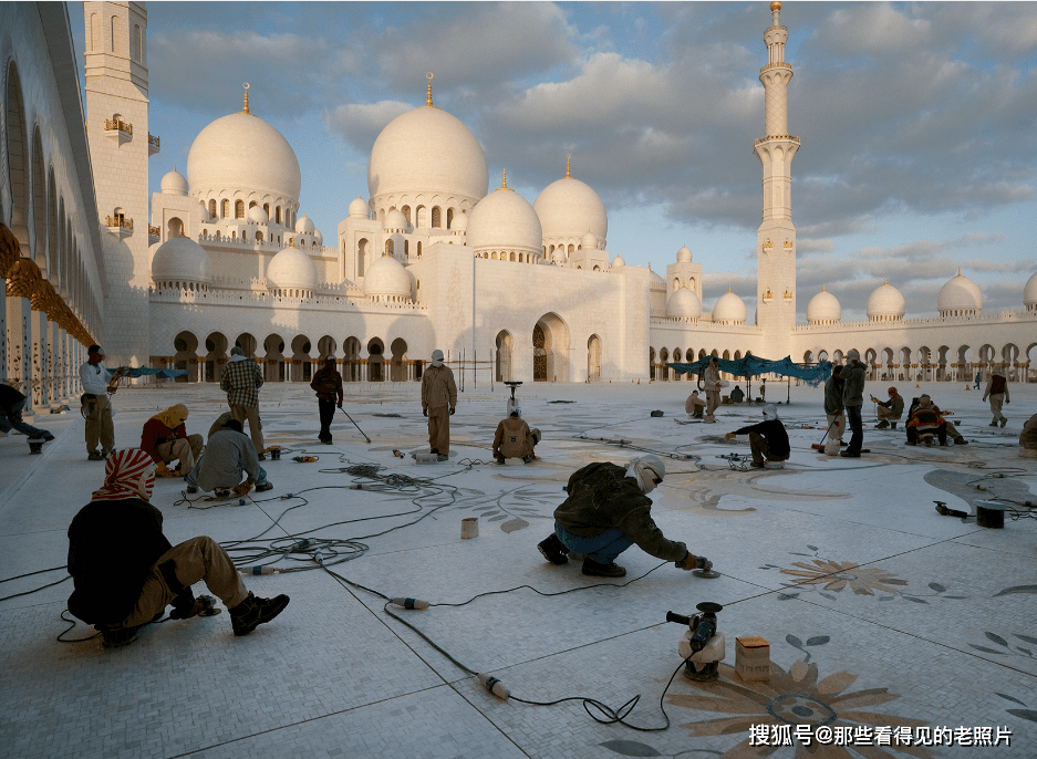 阿布扎比谢赫扎耶德清真寺,抛光水磨石的工人。