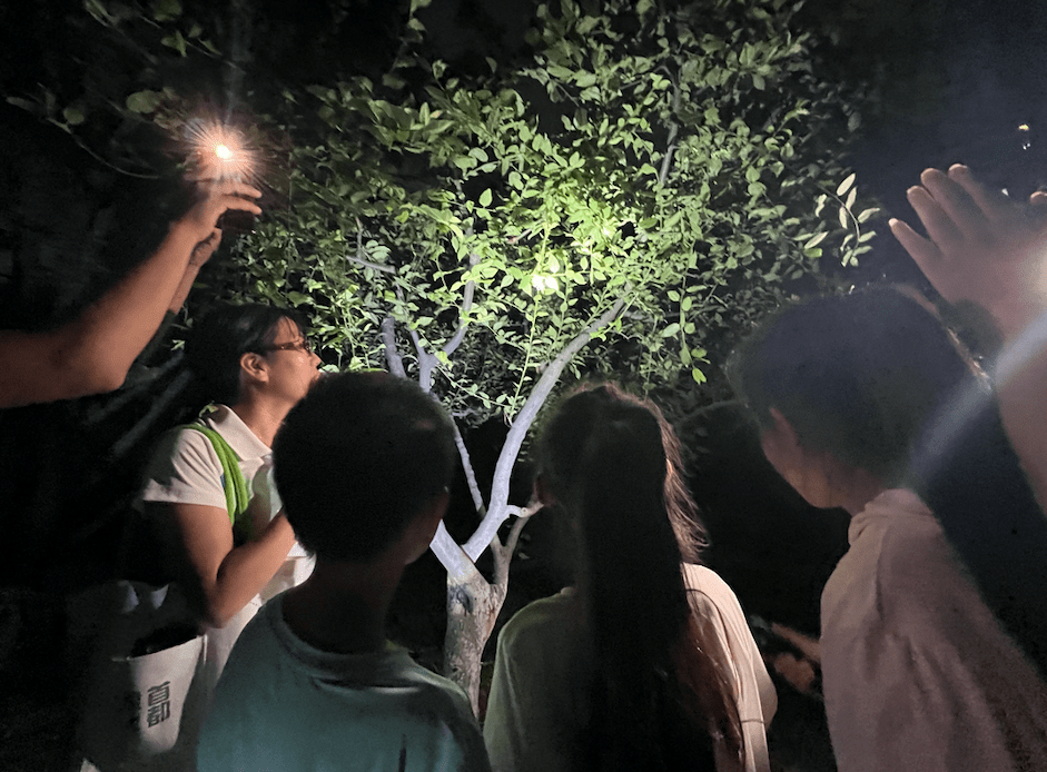 20时,夜幕降临,学生们在带队教师的引领下,分成6组来到草丛、池塘、水榭、竹林等处,开启了夜游植物园之旅。夜晚的植物园尤其静谧,除了老师的讲解和窸窸窣窣的脚步声,还能听到隐藏在角落里的“有声的惊喜”。