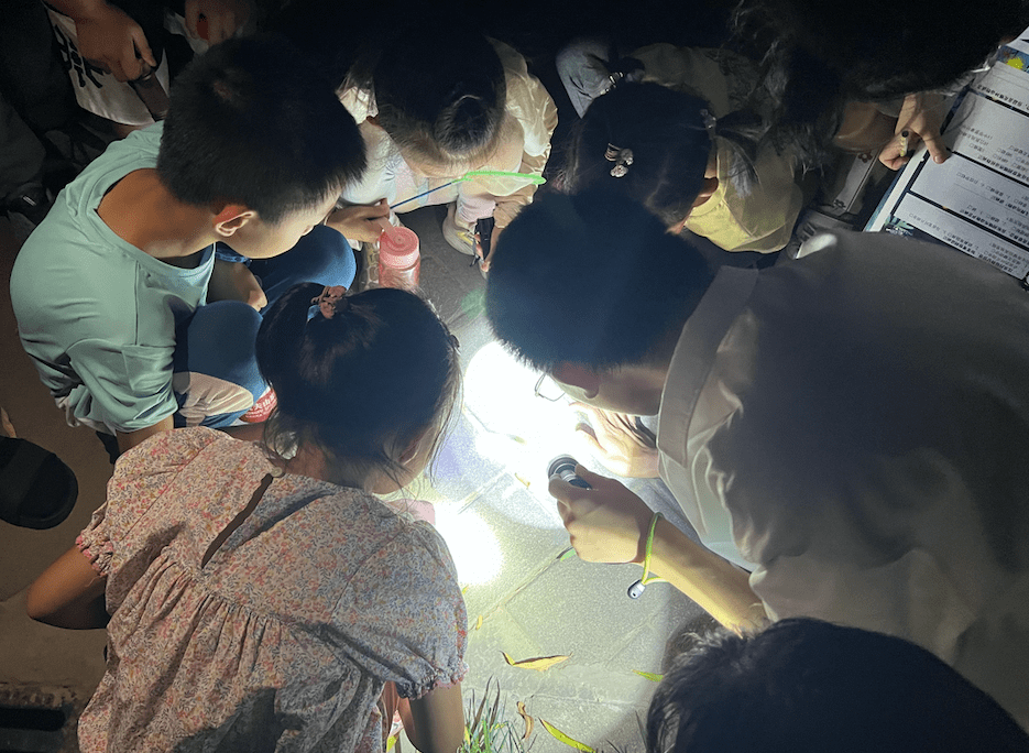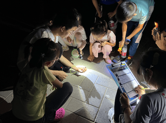 “大家仔细听,有没有白天听不到的声音?”在树林里停下脚步,教师陈建江抛出了第一个问题,学生们纷纷侧着耳朵,屏息凝神仔细听。“老师,有呲呲呲的声音,好像昆虫发出的声音。”“呱呱呱,这是青蛙的叫声!”一声声抢答中,陈建江向学生们一一科普:“大家听到的呲呲声,是蟋蟀摩擦翅膀的声音。蟋蟀和青蛙都习惯夜间进行捕食、繁殖等活动,这也是它们为了躲避天敌而形成的自然习性。”