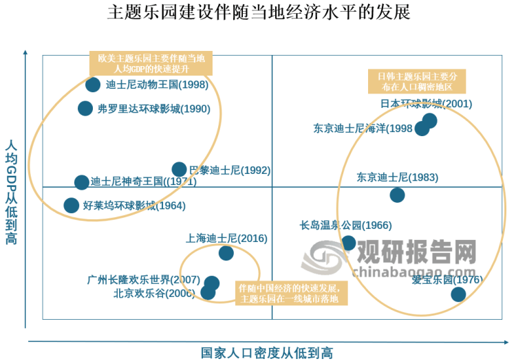全球主题乐园主要分布在人口密度和经济水平较高的地区。主题乐园投资规模大,占地面积广,城市用地为主,需要一定规模、有一定消费能力的客流作为支撑。复盘全球头部主题乐园,建造于 20 世纪的欧美主题乐园主要由当地经济的快速增长驱动,如好莱坞环球影城、巴黎迪士尼等;而日韩地区的主题乐园则同时伴随着当地人口和经济的发展;中国大型主题乐园率先在人口稠密、人均 GDP 较高的东部沿海、一线城市发展起来。
