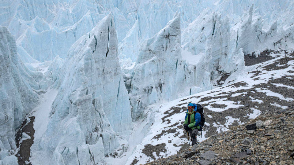 图为高山向导次仁走过珠峰东绒布冰川。新华社记者 晋美多吉 摄