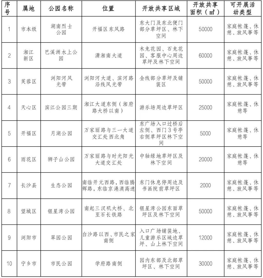 长沙首批10个开放共享城市公园绿地名单及具体开放共享区域