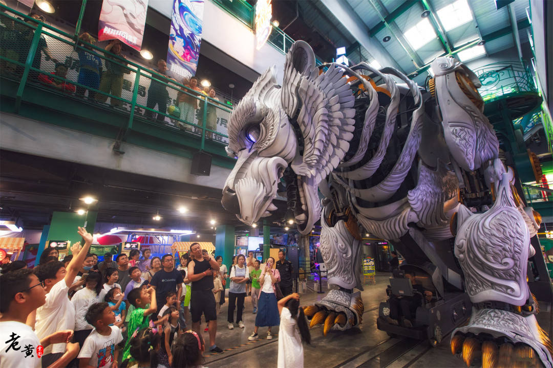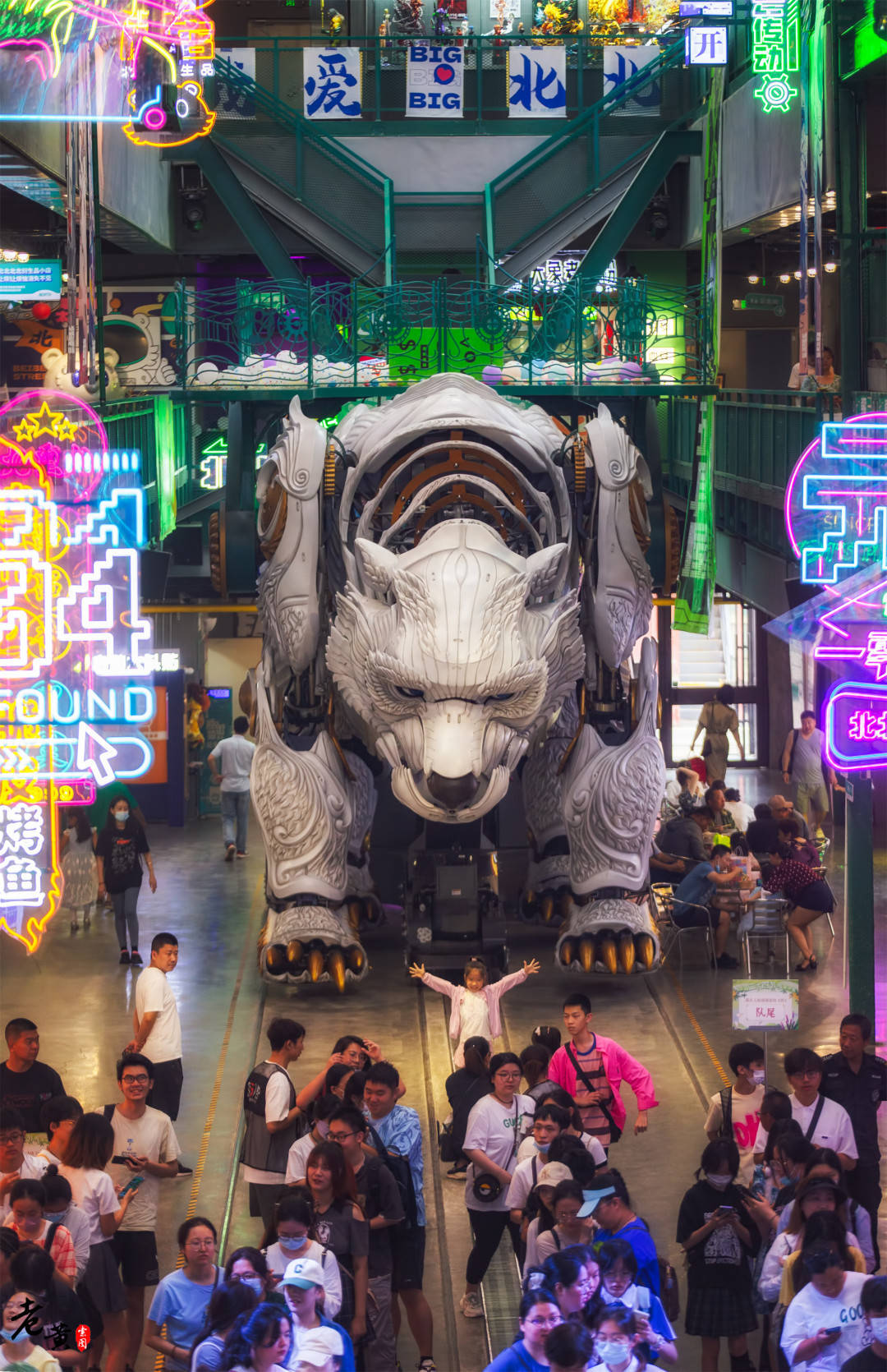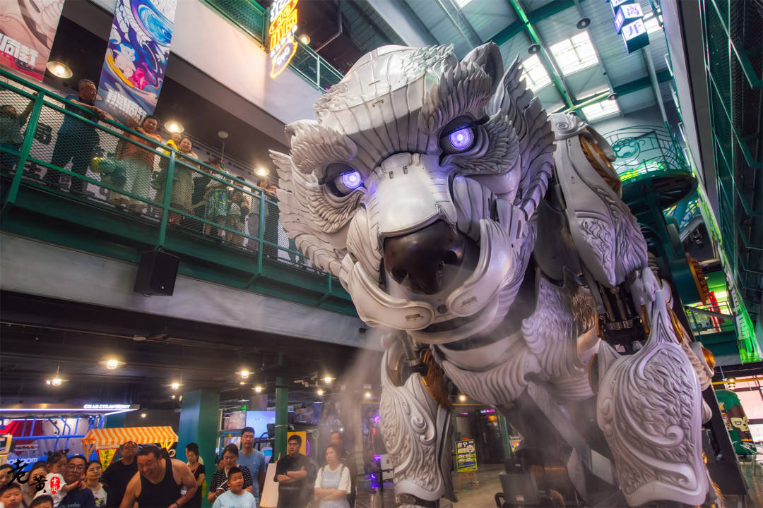 当然全场最大的亮点仍然是那只机器白熊,名为“北北”。据悉“北北”是为大连专属定制的城市IP。你以为这仅仅就是一个静态模型吗?那就太肤浅了,这只大熊可以在人为操作下动起来。甚至可以吐白气,张开大嘴等,仿若活物一般。据介绍,“北北”这个形象,传递出北方人特有的憨厚、善良、热情、温暖,带给无论处于何种情境下,仍努力拼搏的人们更多力量和阳光。