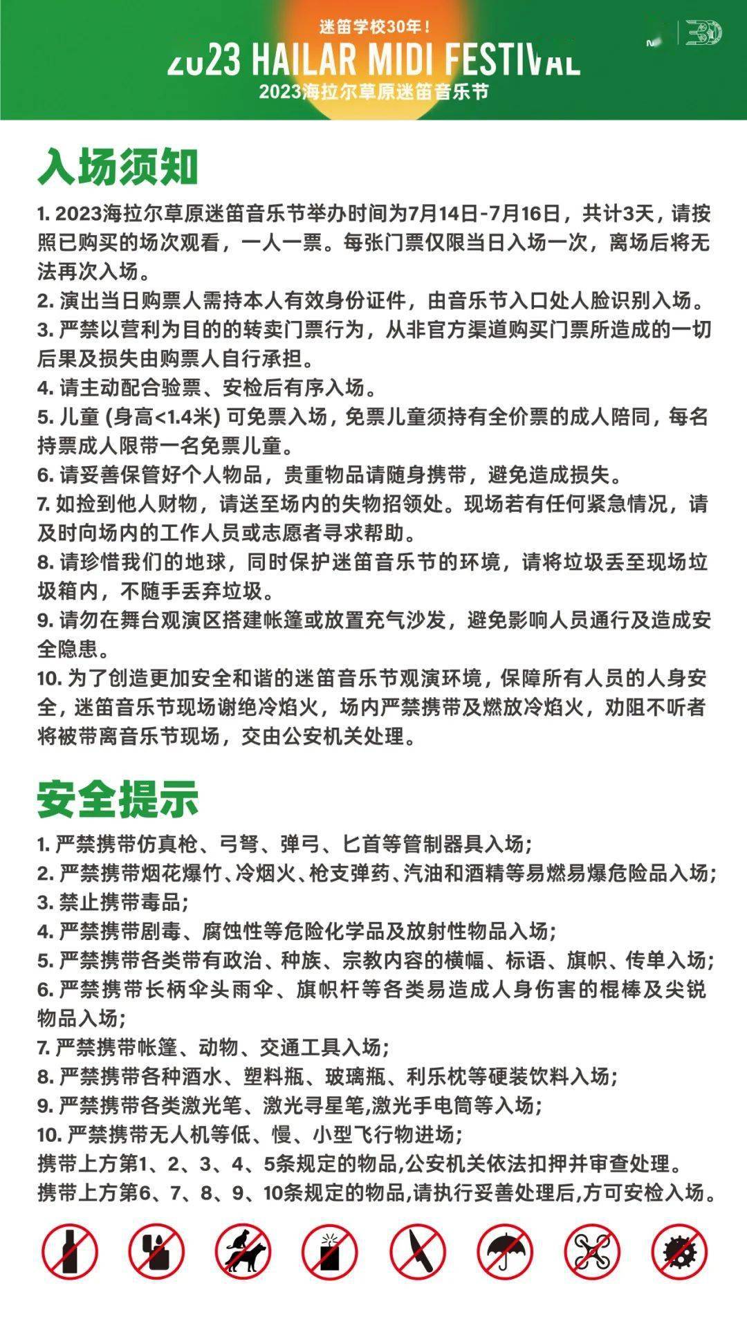 3、本次2023海拉尔草原迷笛音乐节实行严格的 实名制购票观演政策,一票一证,演出当日购票人需 持本人有效身份证件, 检票入场,出场作废,不可再次入场。
