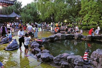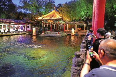 济南人如果不戏一把五龙潭的泉水,都不算真正过了济南的夏天。夏日白天骄阳似火,夜晚在五龙潭公园“清泉石上流”亲泉区域,杨柳依依,泉水潺潺,亭台廊榭,一片清凉舒爽。孩子们在家长的陪伴下脚踏清泉,亲泉戏水,一片嬉笑欢乐。