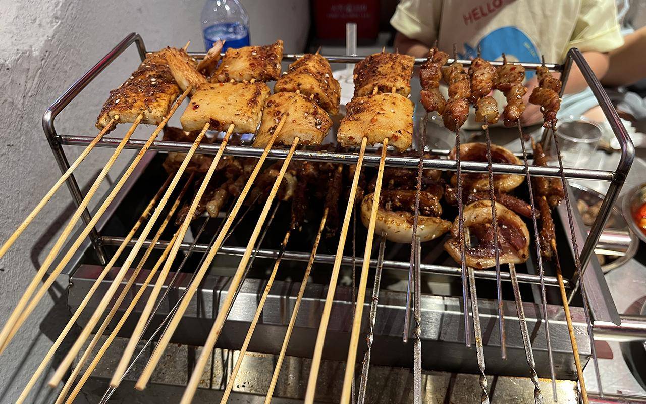 凉菜吃的差不多的时候,烤串就全部端上来了,肉串主要是牛肉串、羊肉串还有五花肉串,以及特大鱿鱼头,另外还有牛板筋以及千叶豆腐和土豆片。