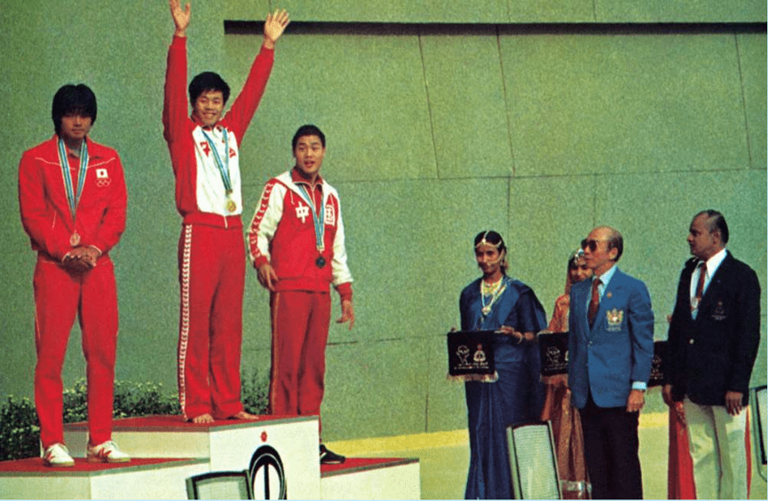 道滘籍运动员叶润成(左二)在1982年新德里举行的第九届亚运会上,是中国在亚运会的第一个游泳冠军,被誉为“亚洲蛙王”。