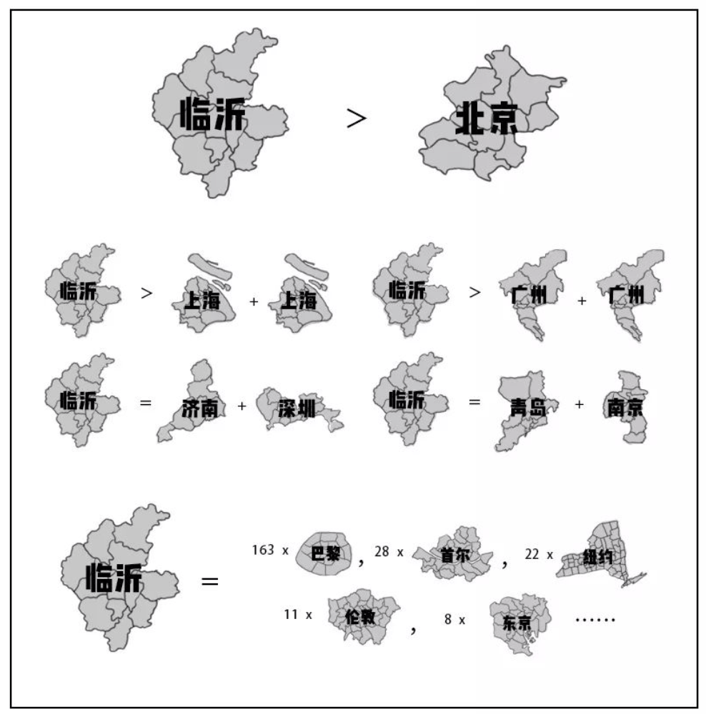 这是什么概念呢?以中国城市作为参考,临沂面积大于两个上海,是济南和深圳之和;和世界级大城市进行对比,临沂抵得上163个巴黎,或者22个纽约,或者11个伦敦……(备注:此处巴黎为大环城公路以内的巴黎城市镇区域,此外还分巴黎辖区和大都会区)