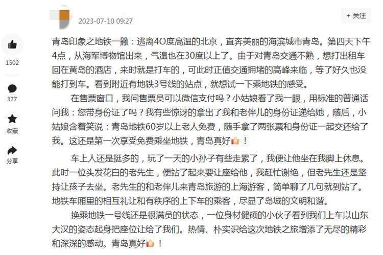“这还是我第一次享受免费乘坐地铁,青岛真好!”“身材健硕的小伙子看到我们上车,以山东大汉的姿态起身把座位让给了我们。”“这次地铁之旅增添了无尽的精彩和深深的感动。青岛真好!”
