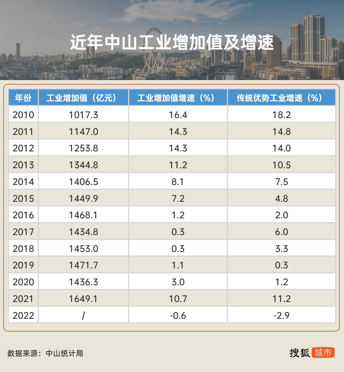 中山的传统优势工业,是家电、金属、建材、纺织、食品和家具等产业。2012年,中山工业增加值1253.8亿元,同比增长14.3%,其中传统优势工业增加值增长14.0%,低于工业增速。2014年起,中山传统工业增加值增速降至个位数。2022年甚至负增长,同比下降2.9%。