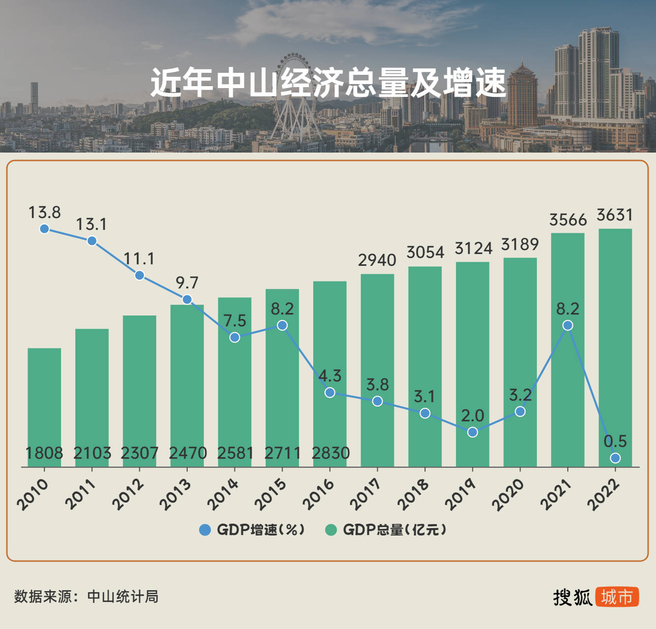 近年,中山逐渐褪去“广东四小虎”光环,经济增长全省垫底。2010-2022年,中山GDP总量从1808亿元增加到3631亿元,名义增长100.8%,居全省末位。2013年以来,中山GDP增速降至个位数,并持续走低;2022年同比增长0.5%,居珠三角九市倒数第一。