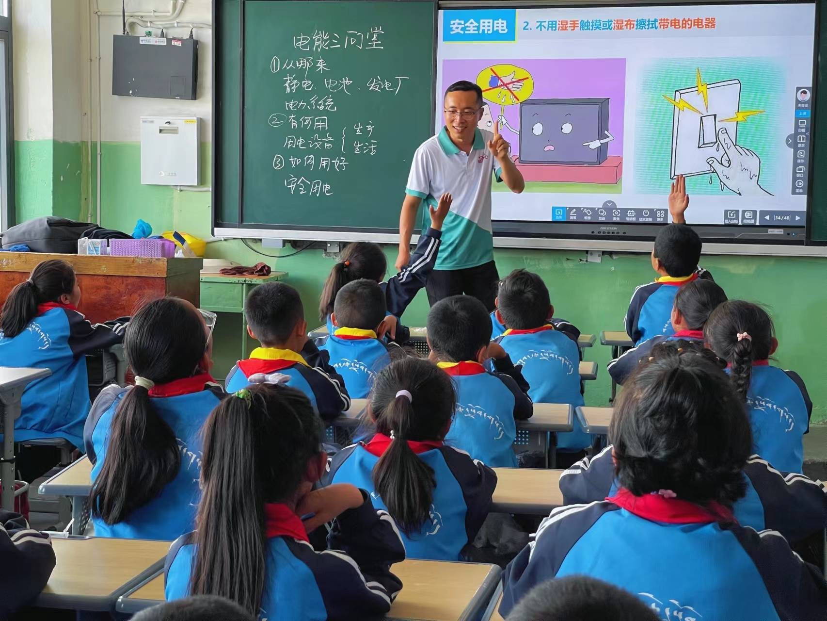 2023年恰逢天津大学自动化学院90周年院庆,为鼓励青年学子深入一线上好“大思政课”,学院组建了“遇见格桑”暑期社会实践队赴西藏日喀则开展为期一周的支教、推普活动。在日喀则市桑珠孜区第一小学,全国青教赛工科组一等奖获得者陈晓龙为同学们讲授课程——《电能三问》。他以藏区孩子能切身感受到的静电和闪电现象作为课程导入,再层层递进地讲解电池、发电厂、电力系统相关知识,让孩子们清晰地了解到走进千家万户的电能到底从哪里来。陈晓龙还利用丰富形象的用电场景图,从安全用电的角度,强化孩子们安全用电意识。