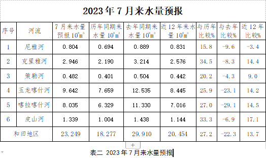 据水文部门预测,7月主要河流来水量23.25亿m3,与历年同期(18.28亿m3)相比偏多27.2%,与去年同期(29.91亿m3)相比偏少22.3%(详见表二)。由于天气变化的随机性,造成河流来水在数量与时间上的不确定性较高,昆仑山北坡季节积雪消融对河流影响大,因此2023年7月上中旬玉龙喀什河、喀拉喀什河、克里雅河、皮山河、策勒河、尼雅河等主要河流来水量比历年偏多的可能性较大。